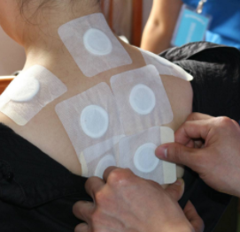 三伏貼又稱三伏天灸,是一種源于清朝的療法,以“冬病夏治”為原理,在一年中最炎熱的三天(“三伏天”)將敷貼在特定穴位上治療秋冬發(fā)作的病。 敷貼的藥如提款卡大小,一般四個(gè)為一組使用,針對不同的病,一般要將四片一起貼在后背的不同位置,保持八小時(shí)即可揭下。